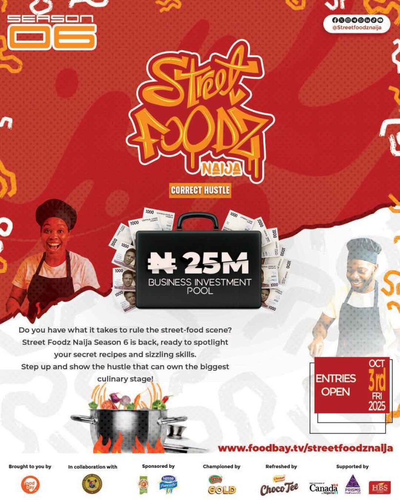 MORE than a show! MORE than a hustle! Street Foodz Naija Season 6 is serious business! No more grants, just real INVESTMENTS into food businesses. A ₦25 million cash pool plus a scholarship to Hospitality Business School; that’s money and skills straight into your hustle to grow it bigger, stronger, unstoppable! We’re raising the stakes! This is your chance to turn street hustle into a thriving food empire.